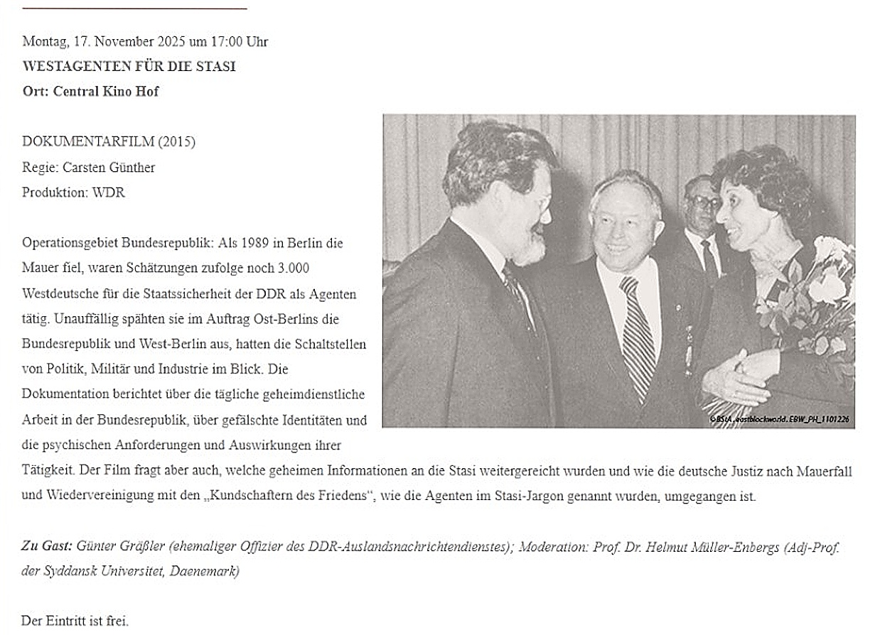Die alte Heimat ruft. Zum 15. Mal finden in den Partnerstädten Hof und Plauen die deutsch-deutschen Filmtage unter dem Motto "Von der Teilung zur Einheit" (Link) statt. Zum dort gezeigten Dokumentarfilm "Westagenten für die Stasi" bin ich als Partner für die anschließenden Gesprächsrunden eingeladen, Moderator ist Prof. Helmut Müller-Enbergs.