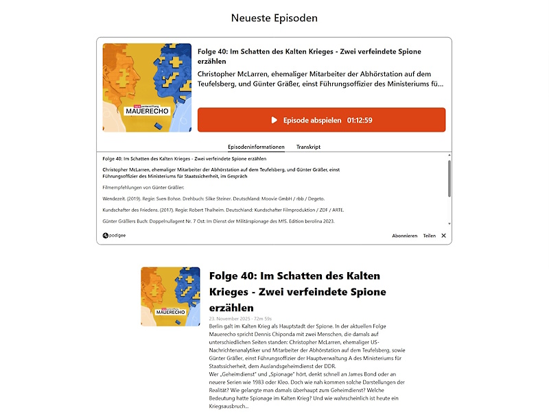 „Mauerecho – Ost trifft West“ ist ein Podcast der taz Panter Stiftung, die sich der Überwindung der mentalen Barrieren zwischen Ost- und Westdeutschland widmet. Ziel ist es, durch persönliche Geschichten, aktuelle Bezüge und interaktive Elemente ein tieferes Verständnis füreinander zu schaffen und die „Mauer in den Köpfen“ abzubauen. Hier der Link zur Folge 40, in der ich mitwirken konnte, gemeinsam mit dem US-Geheimdienstveteranen Christopher McLarren.