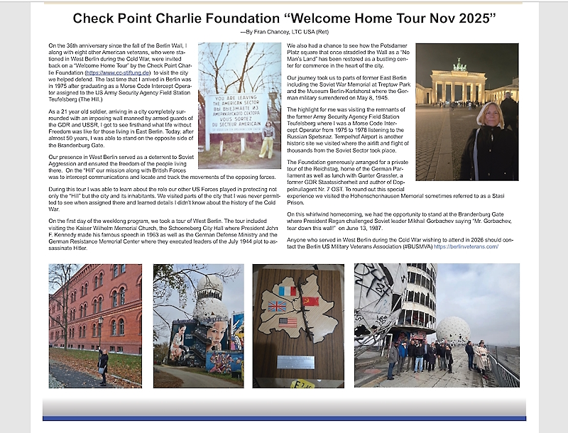 Nachdem ich vor mehr als einem Jahr bei einer Lesung zufällig den Geschäftsführer der "Checkpoint Charlie Stiftung Berlin" Janneck Herre kennenlernte, lud er mich kürzlich zu einem Lunch mit Angehörigen der US-Army, die in Berlin gedient haben, ein. Eine beeindruckende Begegnung, denn hier sprachen Menschen miteinander, die aktiv in völlig gegensätzlichen "Schützengräben des kalten Krieges" unterwegs waren. Einige meiner Gesprächspartner waren bei der Spionageabwehr der Army in Westberlin tätig, andere horchten auf dem "Teufelsberg". Wir verleugneten nicht unsere damaligen Motive und Überzeugungen, gingen aber unvoreingenommen und respektvoll miteinander um: "Wir redeten eben wirklich miteinander". Einig waren wir uns in der Sorge um eine Zuspitzung militärischer Konfrontion, die unsere Generation während des kalten Krieges auch durch unsere nachrichtendienstliche Arbeit zum Glück vermeiden konnte.